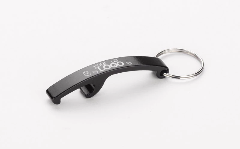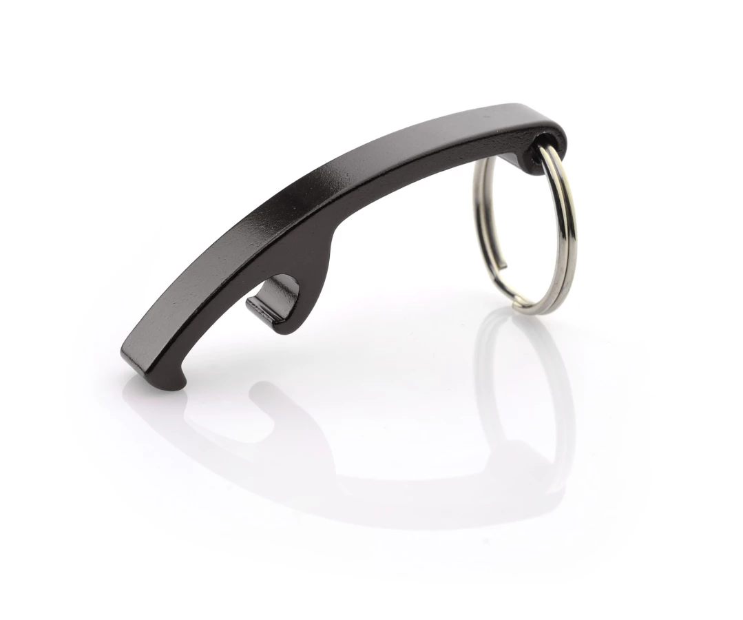 Aluminiowy brelok do kluczy z funkcją otwieracza, dostępny w pięciu kolorach. Pakowany w woreczek foliowy.