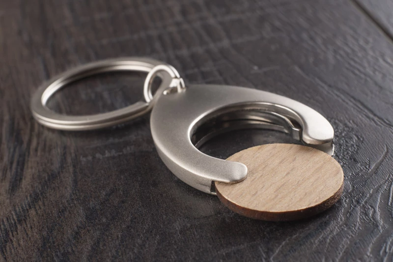Brelok metalowy wraz z żetonem wykonanym z drewna mebli po recyklingu. Żeton pasuje do wózków sklepowych. Zapakowany w brązową kopertę.