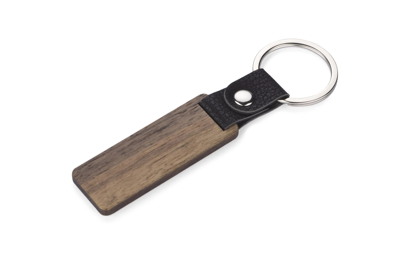 Brelok HASEL to elegancki brelok wykonany z drewna orzechowego. Metalowa obręcz zawieszona jest na skórzanym pasku.