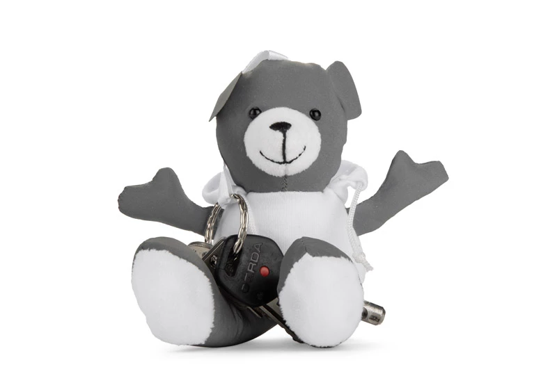 TED to przyjemny brelok reklamowy w kształcie misia w sweterku. Głowa, ręce i nogi zostały wykonane z materiału o połyskującej powierzchni, która odbija światło i przyciąga wzrok. Do misia przyszyta jest biała taśma z poliestru, zakończona metalowym kółkiem umożliwiającym przypięcie do plecaka, torby lub kluczy. Sympatyczny i funkcjonalny dodatek – idealny na sezonowe akcje promocyjne.