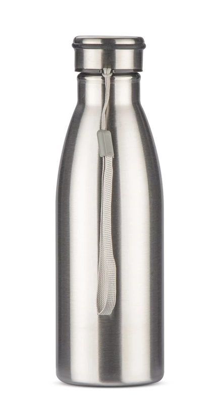Butelka KONRA wykonana ze stali nierdzewnej wygląda elegancko i oryginalnie. Butelka jest zakręcana co zapewnia jej szczelność i swobodę użytkowania. Dołączony sznureczek ułatwia przenoszenie. Pojemność 600 ml.