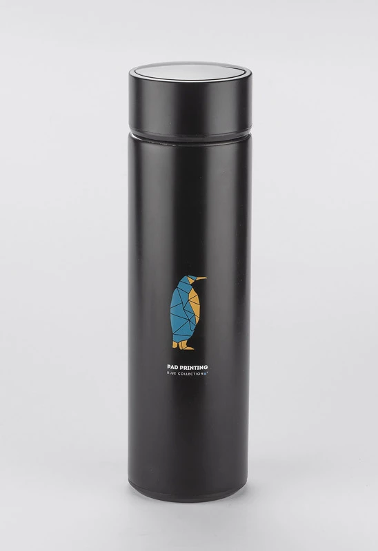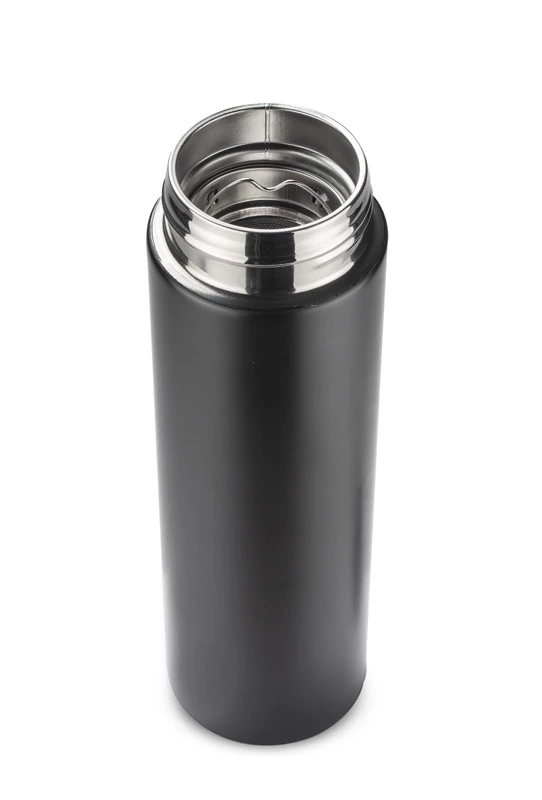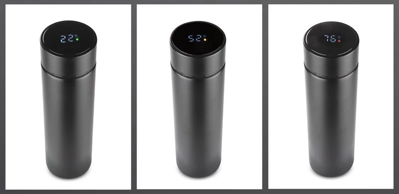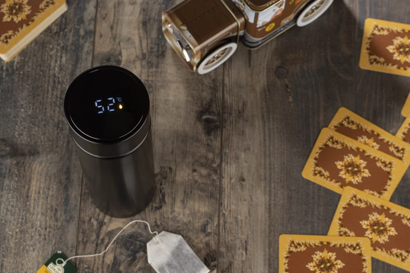Butelka termiczna THERMO to bardzo interesujący gadżet. Łączy w sobie klasyczną funkcję termosu i elektronikę w postaci wbudowanego w nakrętkę dotykowego termometru cyfrowego. Wystarczy obrócić butelkę do góry dnem na 10 sek., aby odczytać najbardziej dokładną temperaturę napoju. Dodatkowo wyświetlana jest ikona kropelki, która zmienia kolor w zależności od temperatury: czerwona, gdy napój jest gorący, żółta, gdy nadaje się do picia, a zielona kiedy jest zimny. Dzięki próżni między ściankami trzyma temperaturę ok. 13 godzin. Wykonana ze stali nierdzewnej 304. Wewnątrz znajduje się sitko, dzięki któremu możemy zaparzyć herbatę.