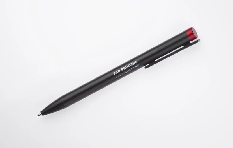 ALI to wyjątkowy długopis umożliwiający wykonanie znakowania w kolorze zbliżonym do końcówki długopisu oraz całkowicie zaskakującego grawerowania w dwóch kolorach - w kolorze zbliżonym do końcówki długopisu oraz białym (kolor aluminium). Czarny metalowy korpus oraz czarne wykończenia stanowią idealne tło dla kolorowego grawerowania. Długopis automatyczny. Wkład typu X20 o grubości 1.0 mm w kolorze niebieskim.