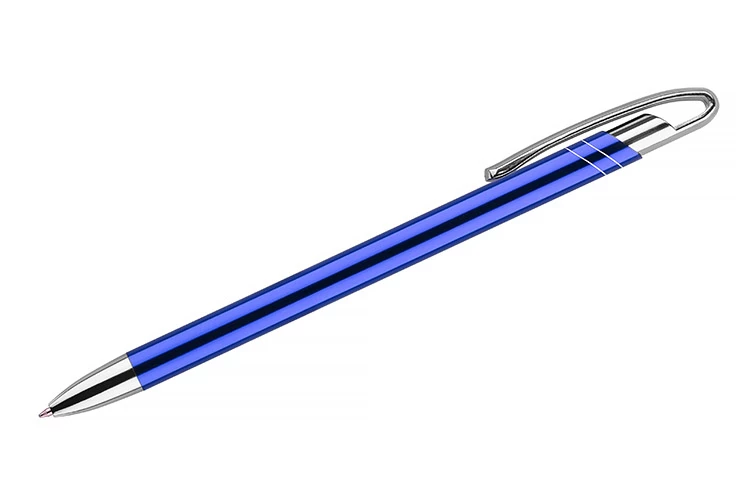 Cienki i zgrabny metalowy długopis w kolorze o metalicznym wykończeniu. Klip i końcówki w kolorze srebrnym chromowanym. AVALO wyróżnia się wśród podobnych długopisów oryginalnym projektem klipu. Korpus ozdobiony został dwoma skośnymi paskami w kolorze srebrnym. Wkład o grubości 0,7 mm w kolorze niebieskim.