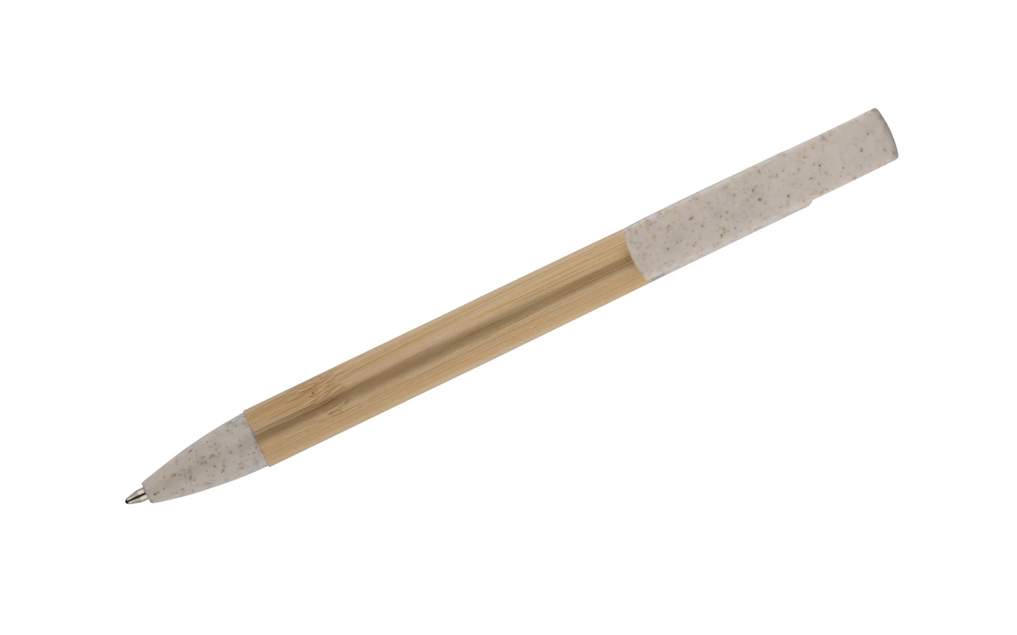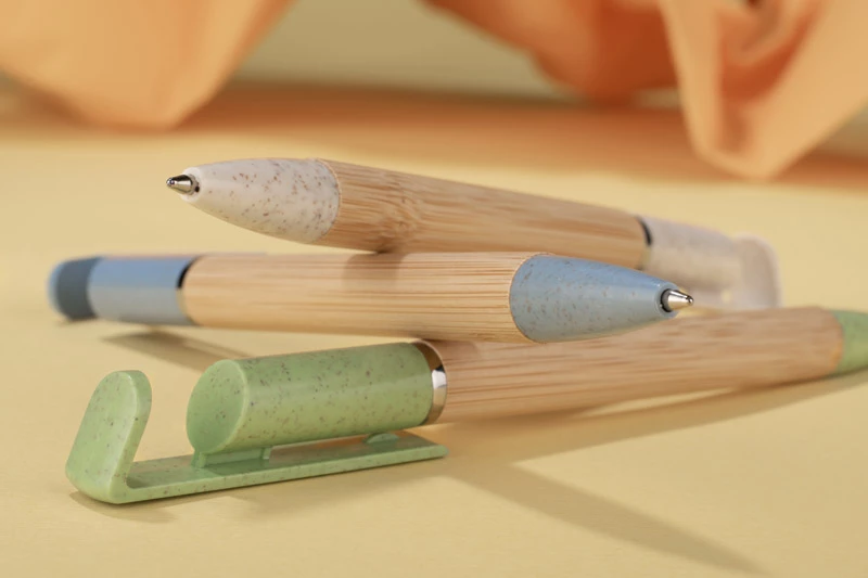 Długopis FONIK z bambusowym korpusem oraz klipem wykonanym ze słomy pszennej to praktyczny gadżet pełniący także funkcję stojaka na telefon.
