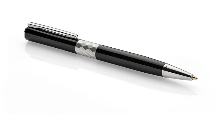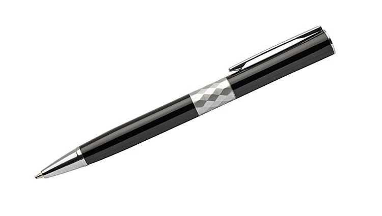 Nowoczesny długopis zaprojektowany zgodnie z najnowszymi trendami. Pośrodku metalowego korpusu znajduje się ozdobny pierścień wyglądem przypominający kryształ, dzięki czemu długopis zyskuje stylowy wygląd. Znakowanie możliwe na korpusie.