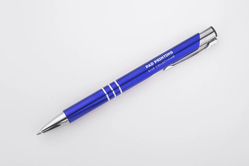 Metalowy długopis o metalizowanej chromowanej powierzchni. Długopis automatyczny z 3 ringami i niebieskim wkładem. Logo grawerujemy na powierzchni długopisu.