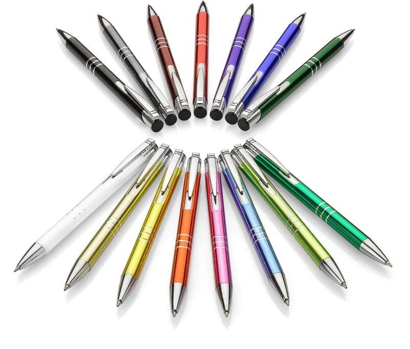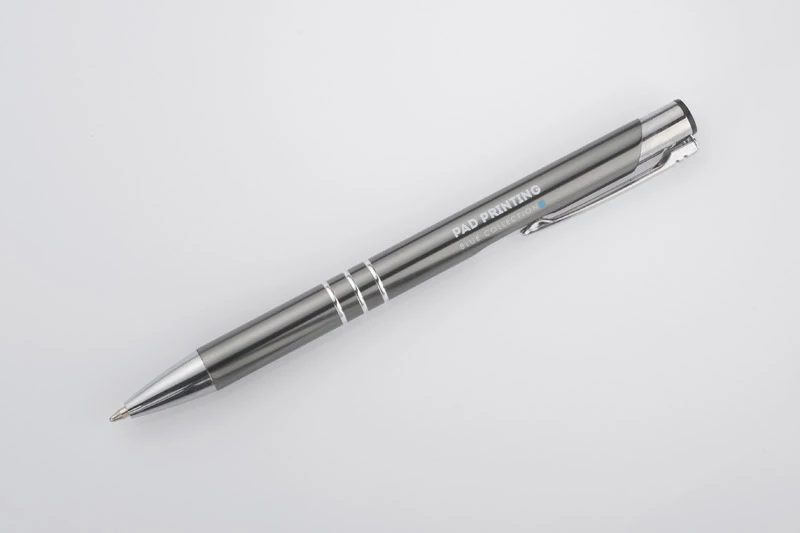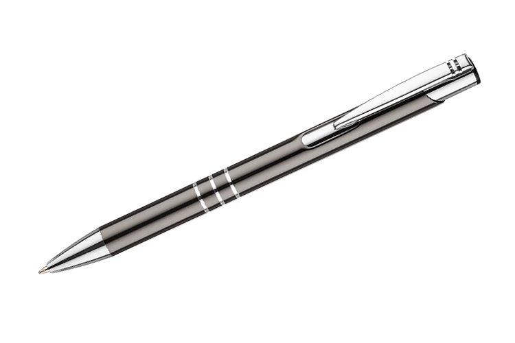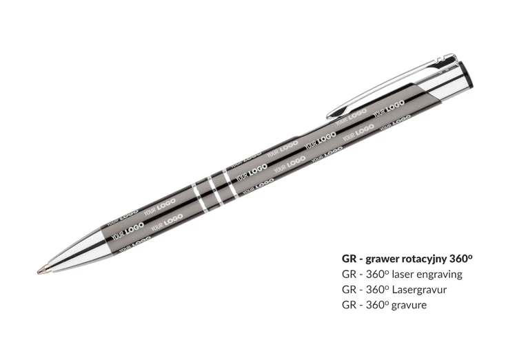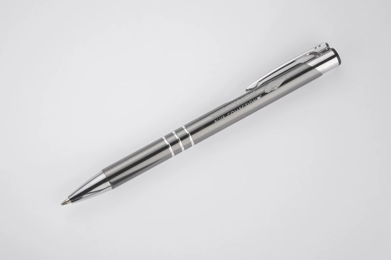 Metalowy długopis o metalizowanej chromowanej powierzchni. Długopis automatyczny z 3 ringami i niebieskim wkładem. Logo grawerujemy na powierzchni długopisu.