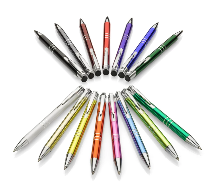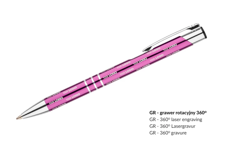 Metalowy długopis KALIPSO o metalizowanej chromowanej powierzchni. Długopis automatyczny z 3 ringami i niebieskim wkładem. Logo grawerujemy na powierzchni długopisu.