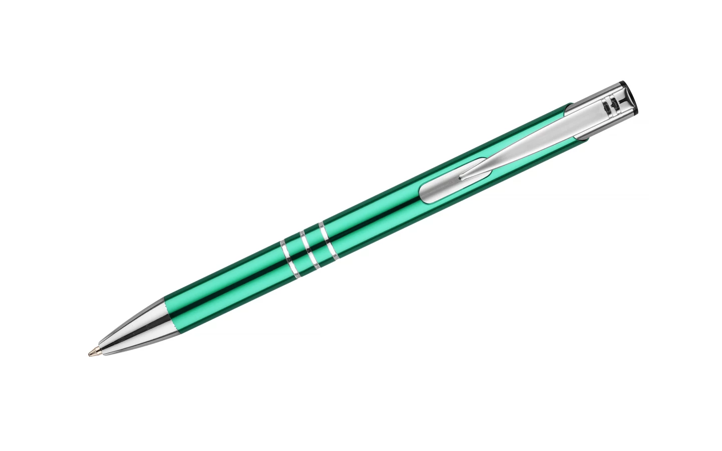 Metalowy długopis KALIPSO o metalizowanej chromowanej powierzchni. Długopis automatyczny z 3 ringami i niebieskim wkładem. Logo grawerujemy na powierzchni długopisu.