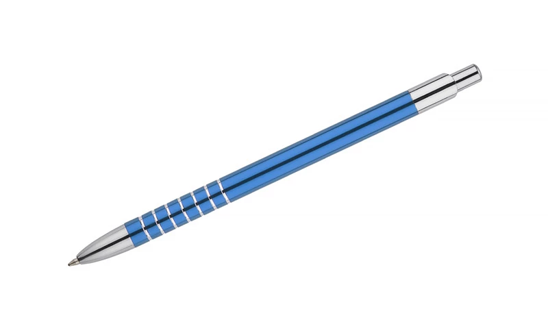 Prosty długopis wykonany z aluminium ozdobiony szerokimi ringami. Logo wygrawerujemy.