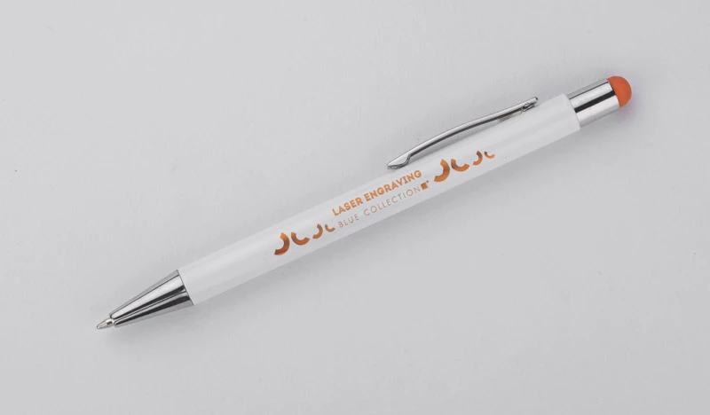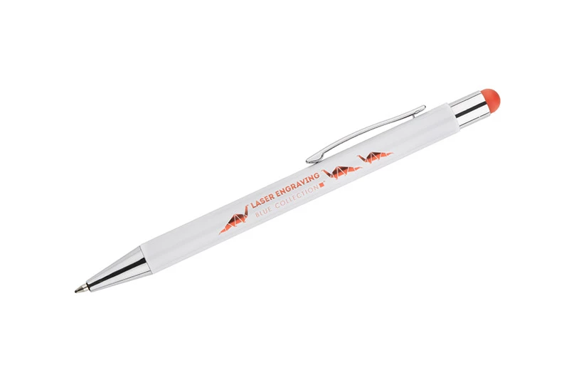 BIANCO to długopis, który zaskakuje efektem znakowania. Kolor grawera jest zbliżony do koloru końcówki touch do obsługi ekranów dotykowych. Korpus wykonany z aluminium pokrytego białą farbą. Długopis automatyczny. Wkład typu G2 w kolorze niebieskim.