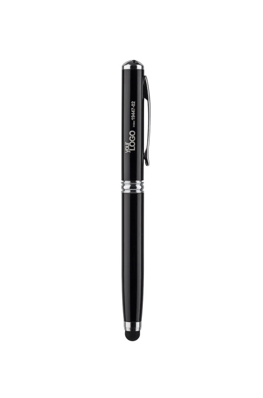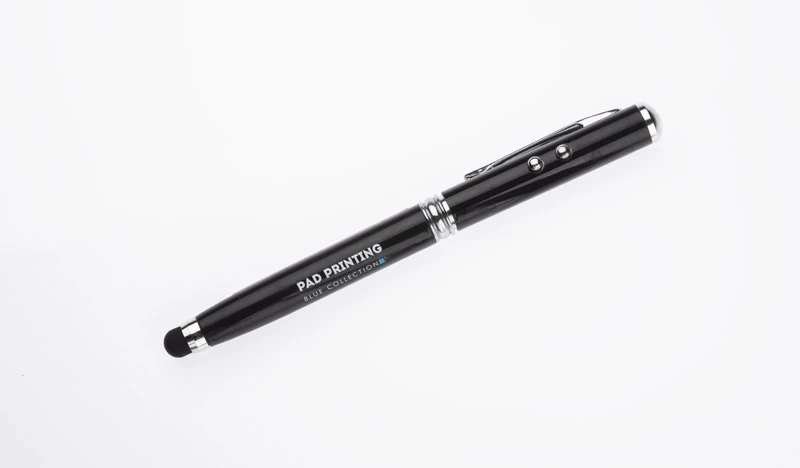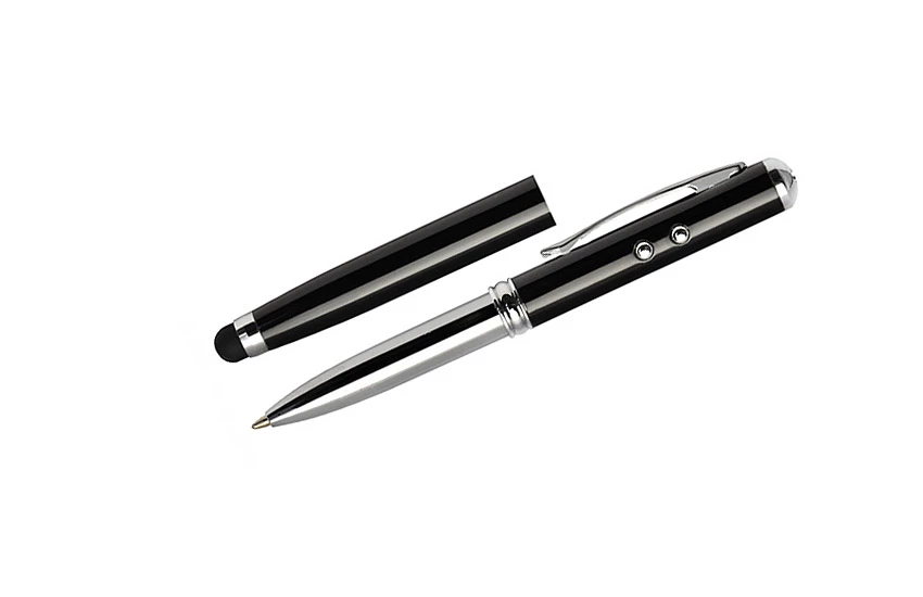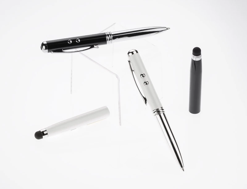 Długopis wykonany z metalu łączący aż cztery praktyczne funkcje: długopis, touch pen, wskaźnik laserowy, latarka. W jednym przyrządzie mieści się wszystko czego można potrzebować w czasie prezentacji multimedialnej lub innych biznesowych spotkań. Zgodnie z dyrektywą Unii Europejskiej (2006/25/EU) i Normą Polska ( PN-EN 60825-1:2005) wskaźnik posiada naklejkę informującą o niebezpieczeństiwe użytkowania. Logo wygrawerujemy.