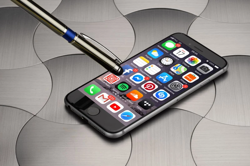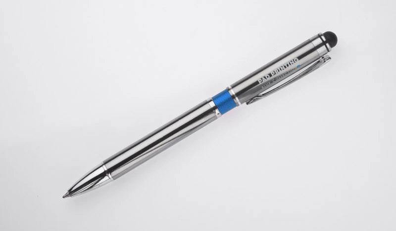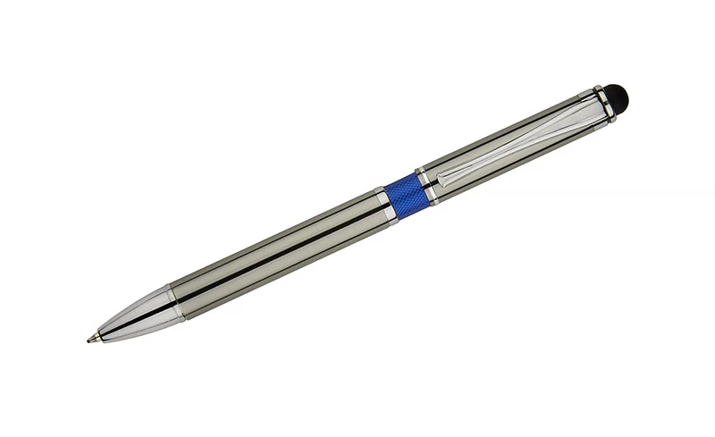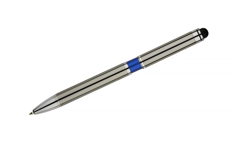 Elegancki metalowy długopis z kolorową aplikacją na korpusie oraz touchpenem.