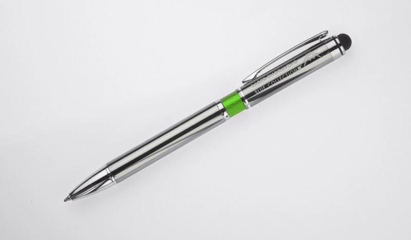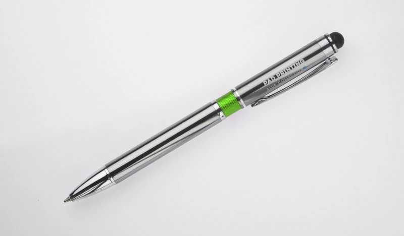 Elegancki metalowy długopis z kolorową aplikacją na korpusie oraz touchpenem.
