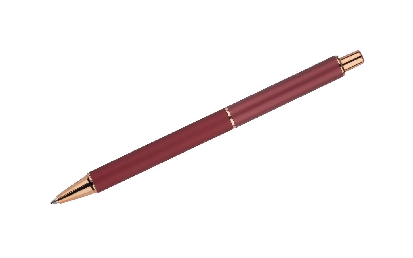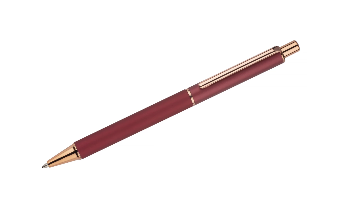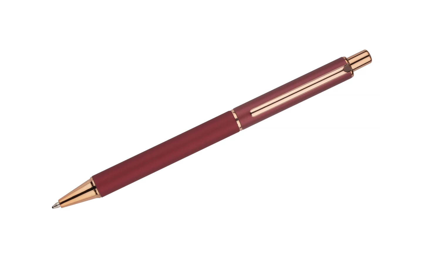 Matowy długopis z akcentami w kolorze różowego złota. Korpus oraz klips wykonane z metalu.