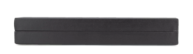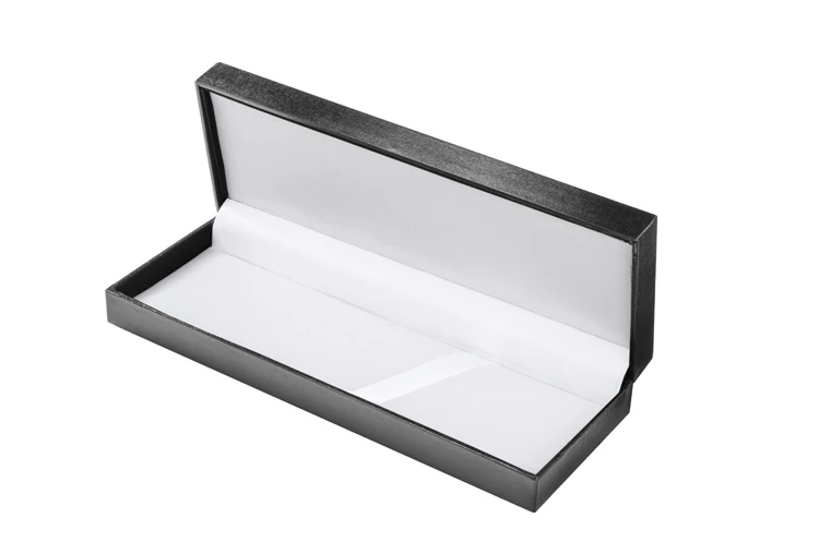 Eleganckie etui na artykuły piśmiennicze wykonane z czarnego papieru ozdobnego pokrytego folią. Wnętrze wyłożone jest białą tkaniną, która pięknie eksponuje artykuły piśmiennicze. Logo nadrukujemy na wieczku. Pasuje do wszystkich modeli długopisów.
