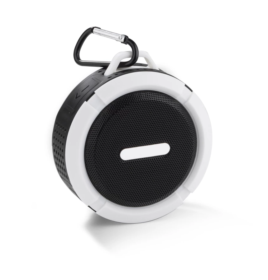 Mały głośnik z przyssawką FUSION. Świetnie nadaje się do użytku turystycznego i na co dzień np. przy lekkim deszczu. Możliwość wykorzystania głośnika jako zestawu głośnomówiącego. Odtwarzanie muzyki jest możliwe za pośrednictwem bluetooth (wersja 4.2) lub karty micro SD. W zestawie kabel do ładowania z końcówką microUSB i karabińczyk. Posiada metalową płytkę przeznaczoną do wykonania znakowania. Produkt jest zgodny z odpowiednimi dyrektywami Unii Europejskiej oraz posiada znak CE. Dane techniczne: Moc wyjściowa: 3W x 1 Napięcie: 5V Stosunek S/N: ≥ 70 dB, czas pracy: 1-1,5 godziny, pojemność baterii 300mAh
