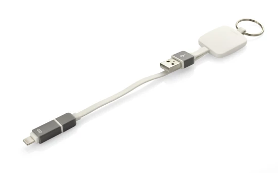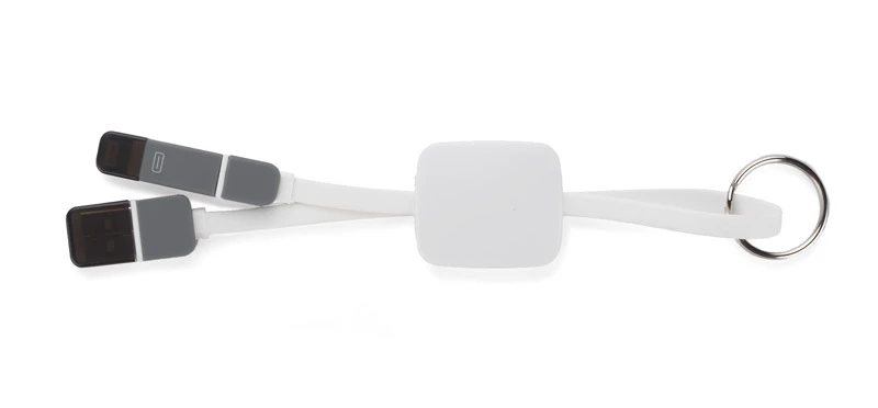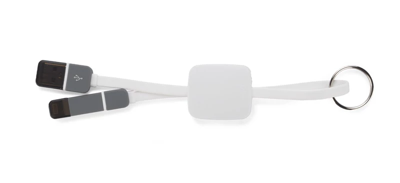 Kabel USB MOBEE łączy w sobie funkcjonalność, atrakcyjny wygląd oraz dedykowane miejsce do wykonania logo. Posiada wtyczkę USB oraz końcówkę micro USB z adapterem do wtyczki typu lightning (iPhone 5 i nowsze). Wtyczki zabezpieczone nasadkami z tworzywa. Kabel może służyć jako dodatek np. do power banka lub stanowić osobny gadżet reklamowy. Przesyła dane.