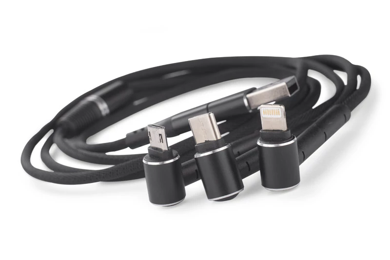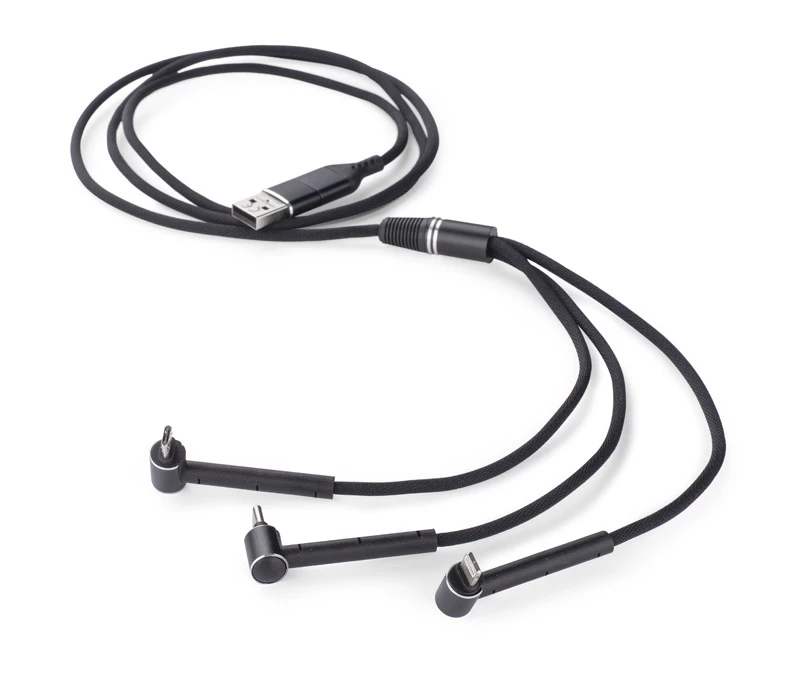 Kabel USB do ładowania RICO to aż sześć funkcji w jednym produkcie. Posiada dwa wejścia: USB-A i USB-C i trzy wyjścia: micro USB, USB-C i Lightning (iPhone). Dodatkowo, trzy końcówki posiadają specjalne wzmocnienia z tworzywa, które umożliwiają zastosowanie kabla jako stojaka na telefon! Sam przewód powleczony jest wytrzymałym materiałem i ma długość ok. 1,20 m. Tylko do ładowania.