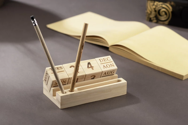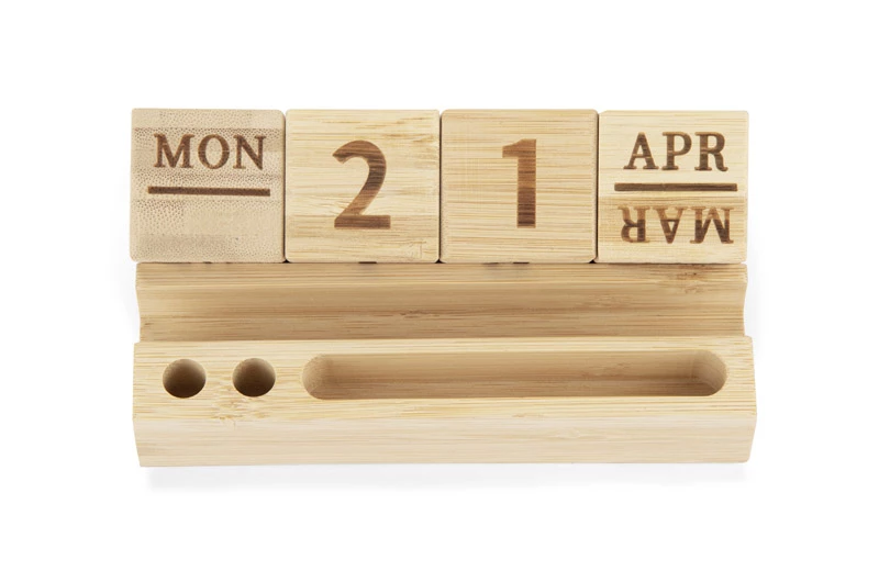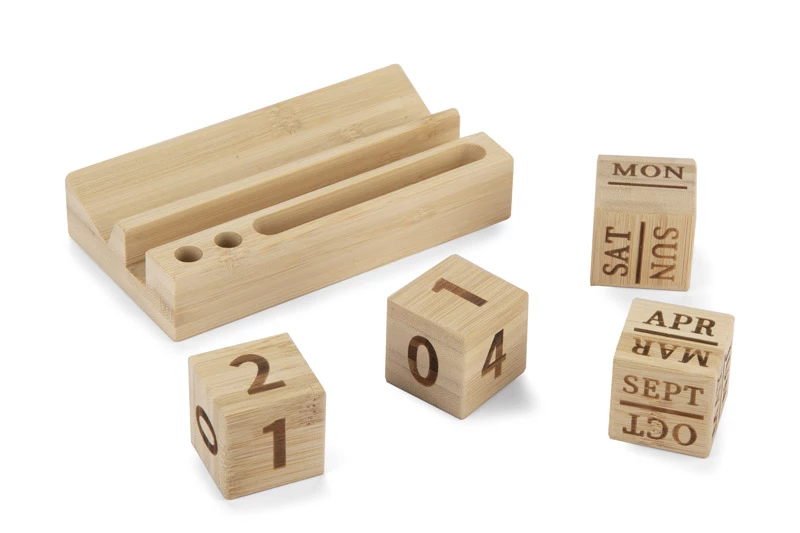 NEN to propozycja wiecznego kalendarza wykonanego w całości z naturalnego bambusa, który jest wielokrotnego użytku i może służyć przez wiele lat. Kalendarz wyposażony jest w bambusowe klocki wskazujące nazwę dnia tygodnia, dzień miesiąca oraz nazwę miesiąca. Może pełnić funkcję praktycznego stojaka na biurko, z miejscem na przybory piśmiennicze, drobne akcesoria biurowe oraz telefon. Jego funkcjonalność i estetyka sprawiają, że stanowi doskonały gadżet reklamowy do biura. NEN to świetny wybór na spersonalizowany prezent firmowy lub element dekoracyjny w przestrzeni roboczej.