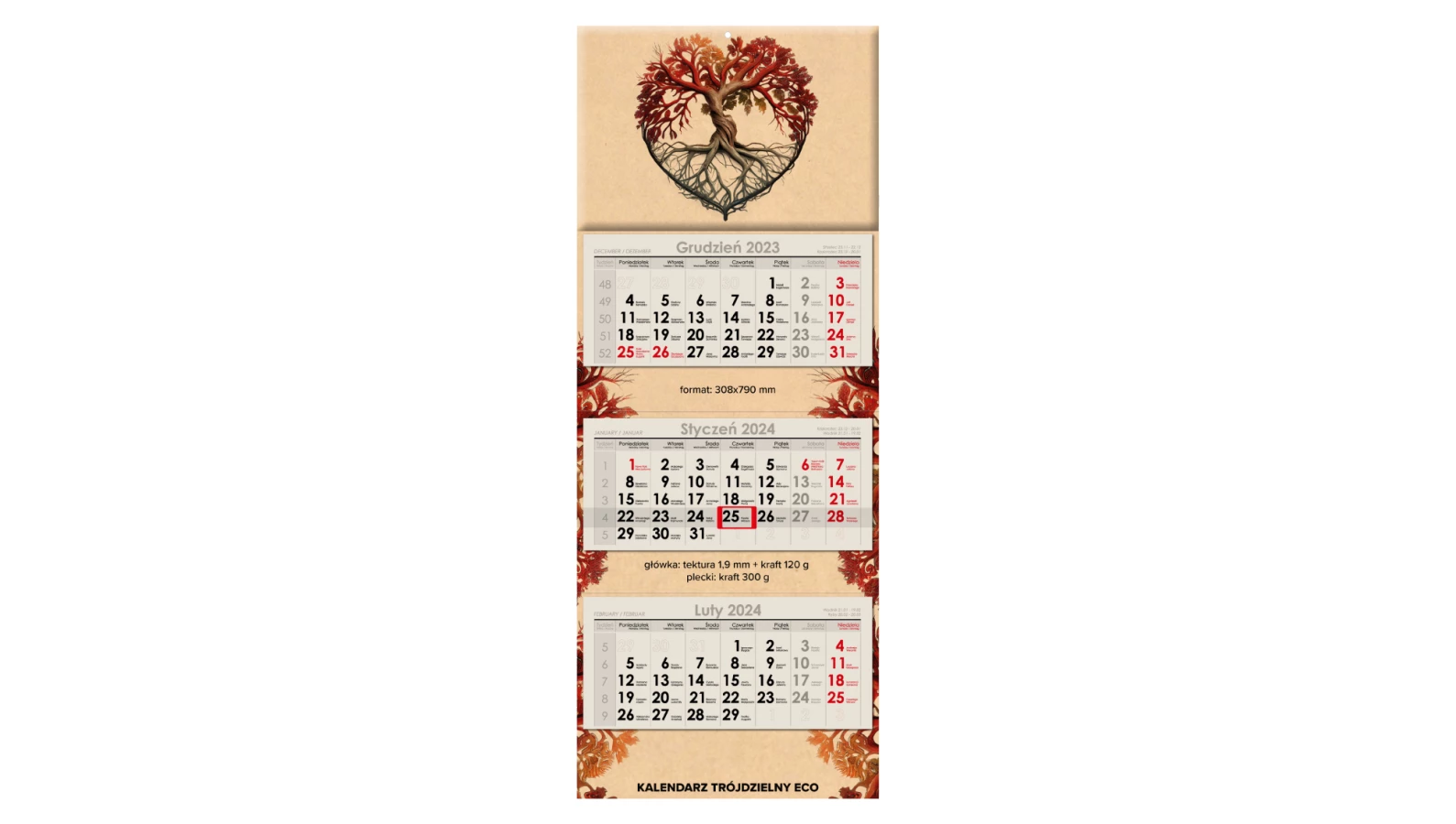 Główka kalendarza wykonana jest ze sztywnej tektury, co zapewnia trwałość i elegancki wygląd.Oklejona papierem kraft, na którym wykonany jest druk główka, prezentuje się naturalnie i ekologicznie, co nadaje jej wyjątkowy, rustykalny charakter. Plecki kalendarza wykonane są z papieru kraftowego o gramaturze 300 g, co gwarantuje stabilność i wytrzymałość całej konstrukcji, a jednocześnie podkreśla ekologiczny charakter produktu.