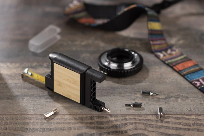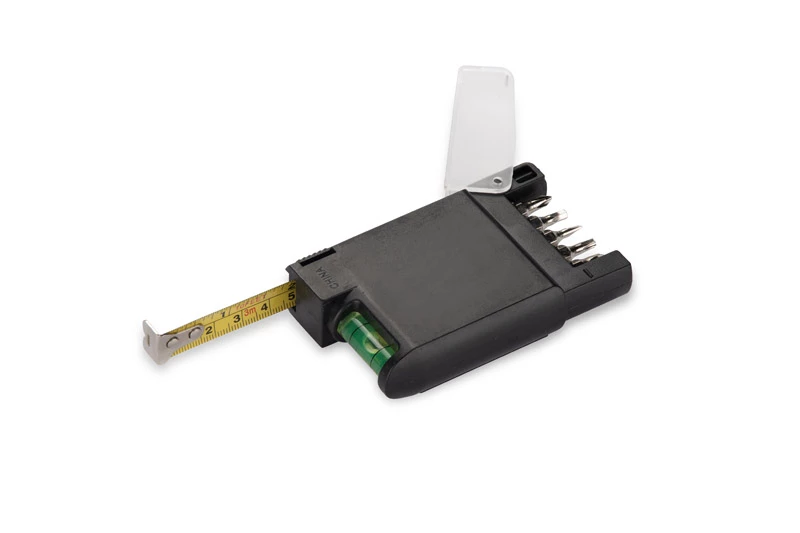 Narzędzie wielofunkcyjne ALGO wyposażone w 3-metrową miarkę, poziomicę oraz wbudowany wkrętak z wymiennymi bitami. Umożliwia mierzenie, montaż i poziomowanie.