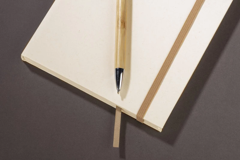 Okładka i kartki w notesie zostały wyprodukowane z kartonów po mleku. Okładka zamykana za pomocą elastycznej gumki. Wewnątrz znajduje się wstążeczka pełniąca funkcję zakładki. Format A5, 80 gładkich kartek.