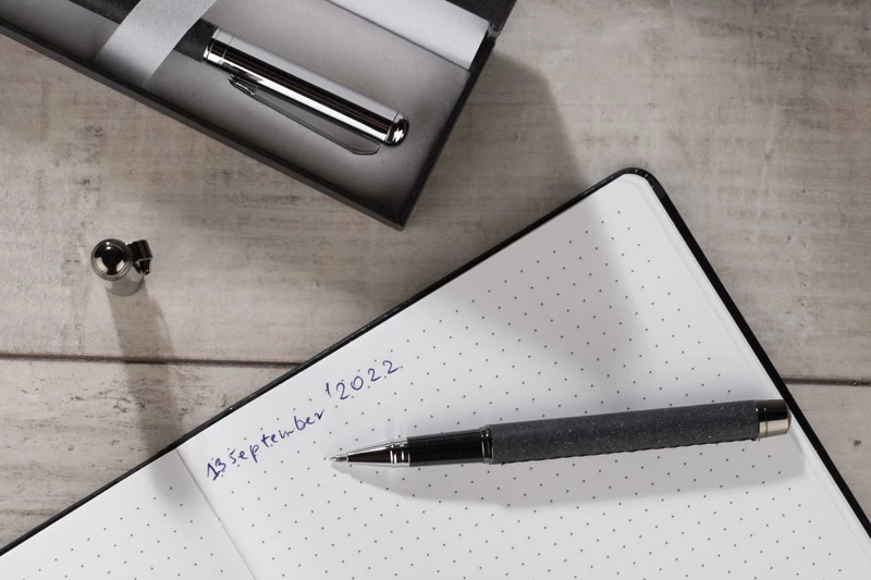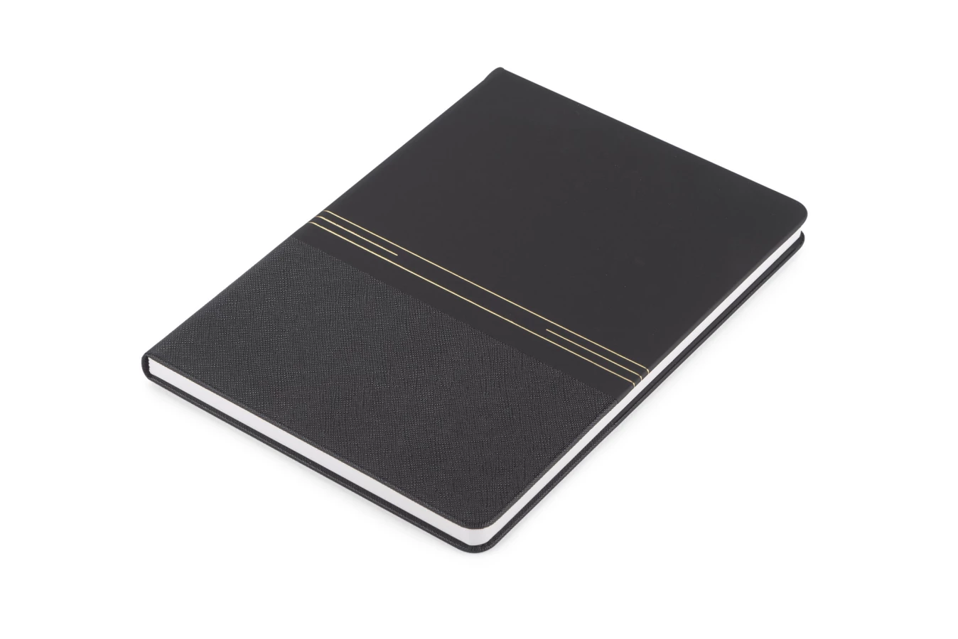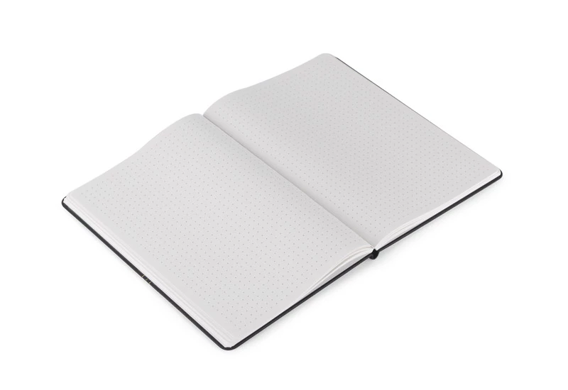 Elegancki notes w twardej okładce z ozdobnym złoceniem. Kartki w notesie wyprodukowane zostały z papieru kamiennego. Taki papier jest wyjątkowo odporny na rozdarcia oraz na wilgoć. Posiada 80 kartek w kropki. Format A5.