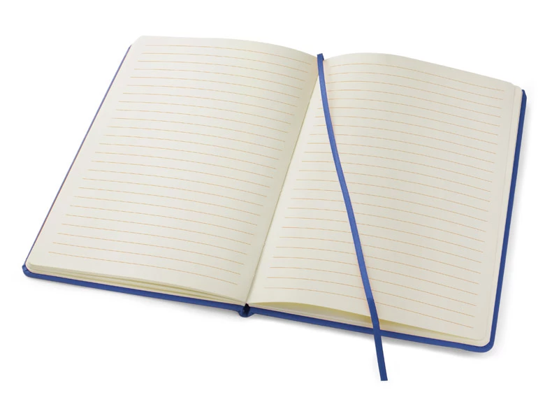 Gustowny notes A5 z kolorową gumką wykonany z materiału skóropodobnego (PU). Notes zawiera 80 kartek ecru w linie koloru pomarańczowego. Logo nadrukujemy na okładce.