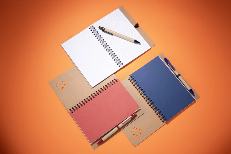 Notes SERENO na spirali w klasycznej, papierowej okładce. Posiada 70 kartek w linie. Do notesu dołączony jest w wyprofilowanym miejscu długopis, którego korpus wykonany jest z papieru. Wykończenia długopisu pasują kolorystycznie z przekładką notesu. Wkład w długopisie w kolorze niebieskim.