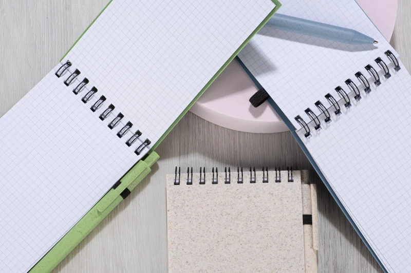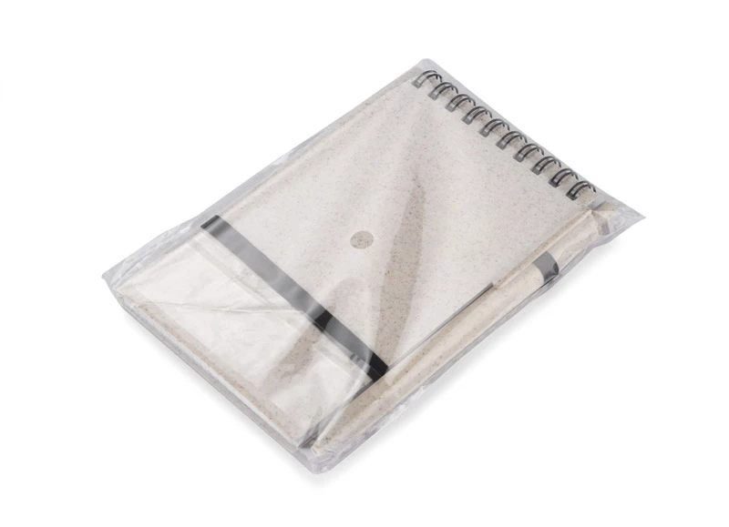 Notes TRESA z długopisem, kolorystyką dopasowanym do okładki. Długopis oraz okładka notesu wykonane są ze słomy pszenicznej. Notes na spirali, posiada 70 kartek w kratkę wykonanych z recyklingowanego papieru. Zamykany za pomocą gumki. Format A6. Wkład w długopisie w kolorze niebieskim.