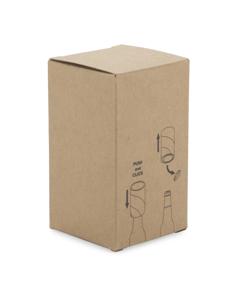 Otwieracz do butelek KOL wykonany z trwałego tworzywa ABS. Umożliwia otwarcie butelki z kapslem w łatwy sposób. Zapakowany w kartonik z papieru kraftowego. Posiada infografikę sugerującą sposób użycia.