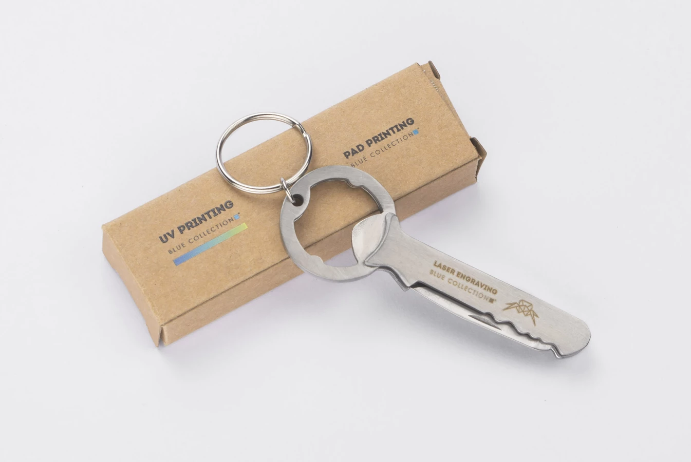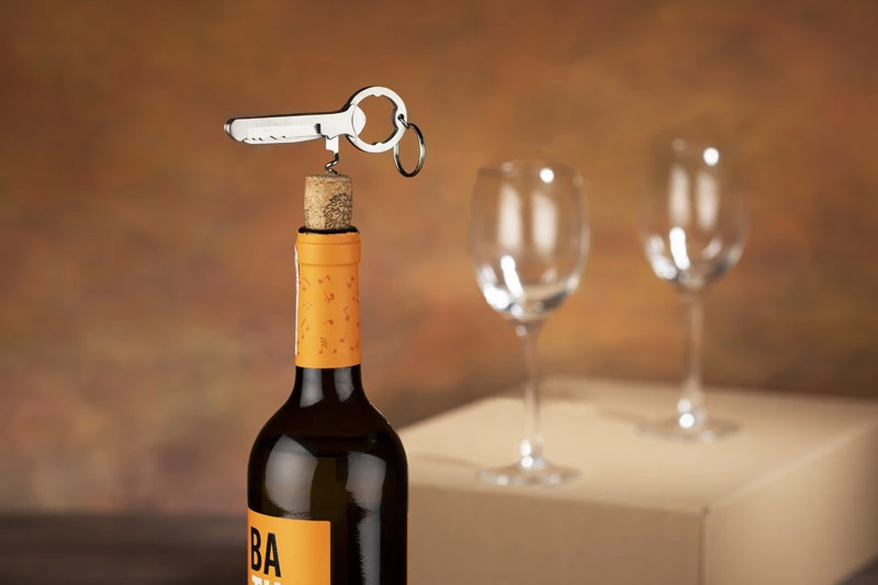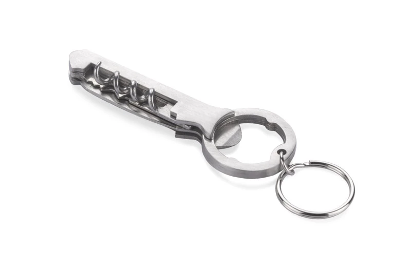 Alco posiada 3 funkcje: brelok, otwieracz do kapsli oraz korkociąg do wina. Wykonany ze stali nierdzewnej. Zapakowany w brązowy kartonik.