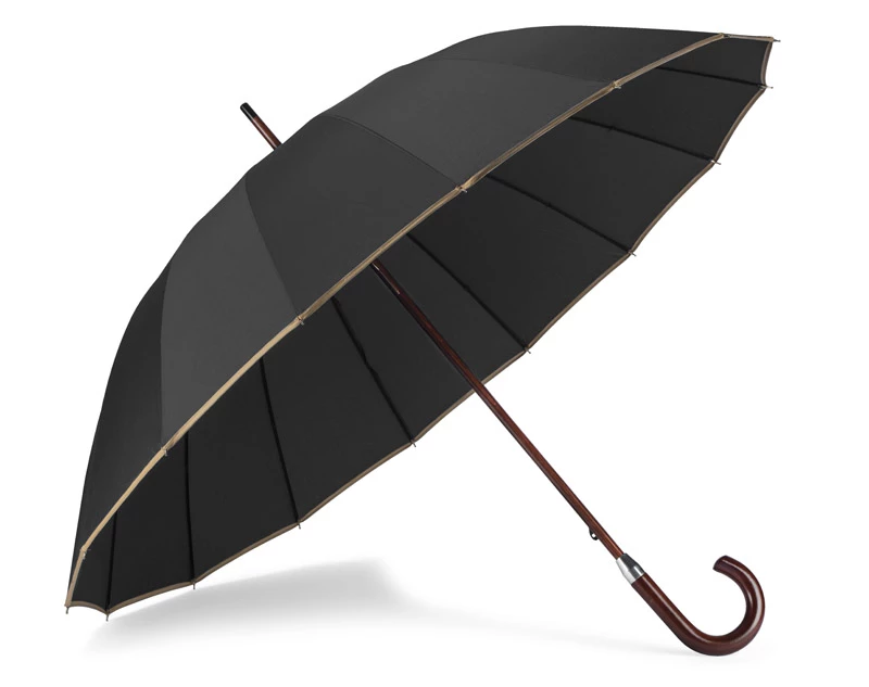 Bardzo elegancki parasol manualny, szesnasto panelowy, zakończony drewnianą zakrzywioną rączką. Wykonany z materiału typu pongee 190 T. Śr czaszy po rozłożeniu to 112 cm, długość złożonego parasola to 90 cm. Szerokość panelu wynosi 22 cm. Nadruk logo wykonamy na czaszy parasola metodą sitodruku.