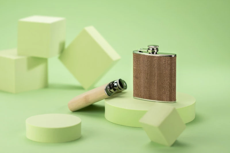 Piersiówka ze stali nierdzewnej o pojemności 200 ml z bezpiecznym zamknięciem. Wykończona jest bardzo cienką warstwą naturalnego drewna.