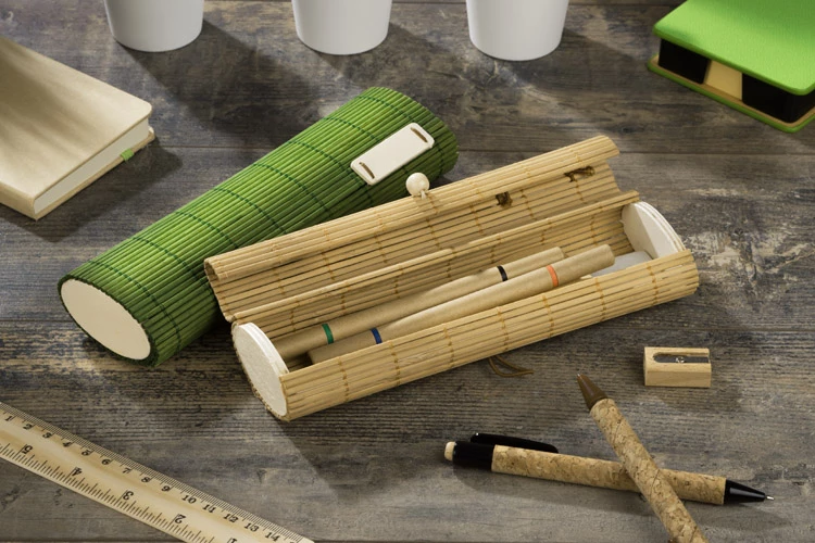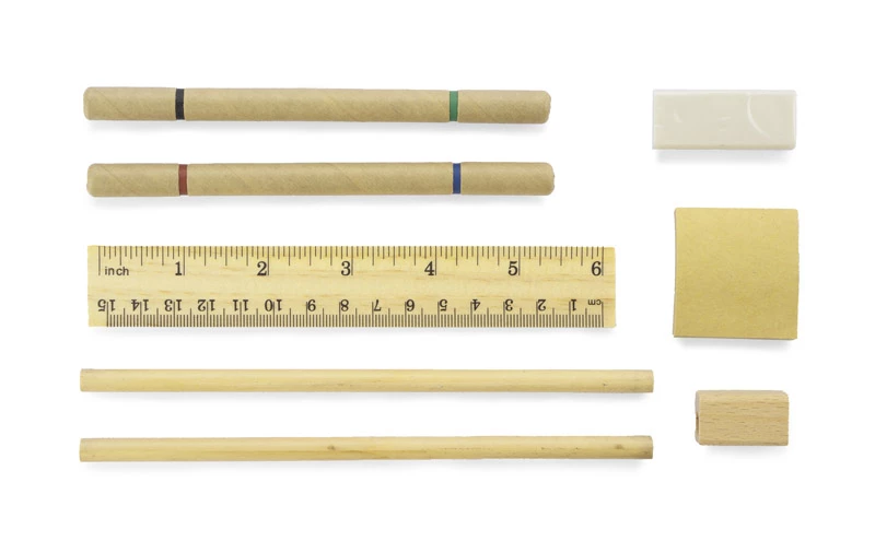 Bambusowy piórnik z ekologicznymi przyborami zawiera: dwa dwustronne długopisy (czerwony, niebieski, zielony i czarny), dwa ołówki, linijkę, temperówkę, gumkę do mazania oraz karteczki samoprzylepne. Ekologia, piękny wygląd i możliwość praktycznego zastosowania w jednym produkcie.