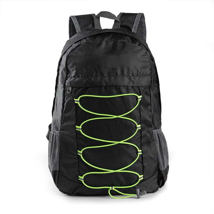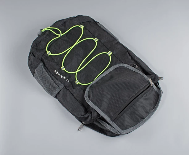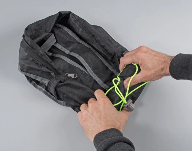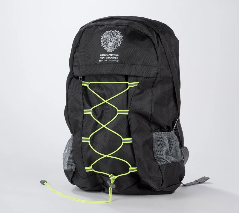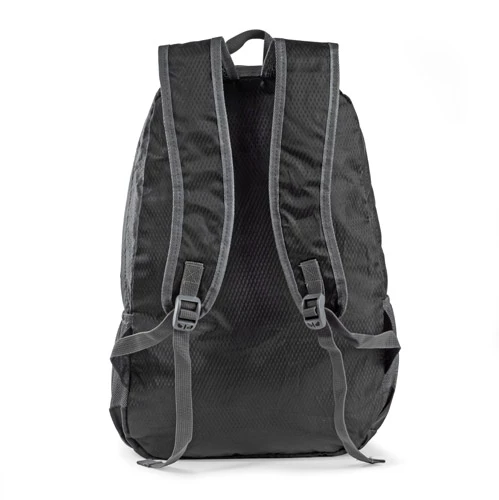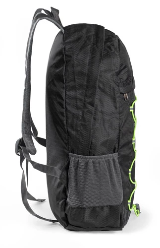 Wykonany z poliestru plecak BAKKU jest lekki, a jego wytrzymałość sięga 10 kg. Zielone gumki przełamują dominującą czerń i stanowią praktyczny element w podróży. Dodatkowym atutem jest możliwość złożenia plecaka do niewielkich rozmiarów, co pozwala zaoszczędzić miejsce.