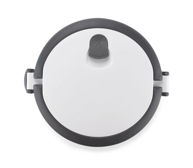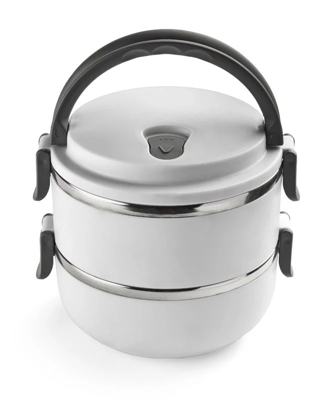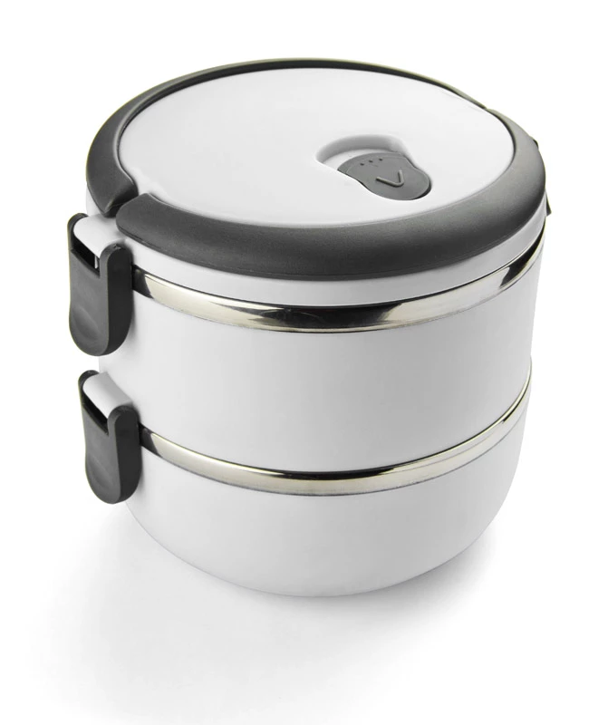 Pojemnik z wnętrzem ze stali nierdzewnej podzielony na dwie komory, które składamy jedną na drugą, co zapewnia poręczne i wygodne przenoszenie dwudaniowych posiłków. Górna komora wyposażona w uszczelkę. Uchwyty z tworzywa sztucznego z możliwością złożenia. Łączna pojemność: 1400 ml.