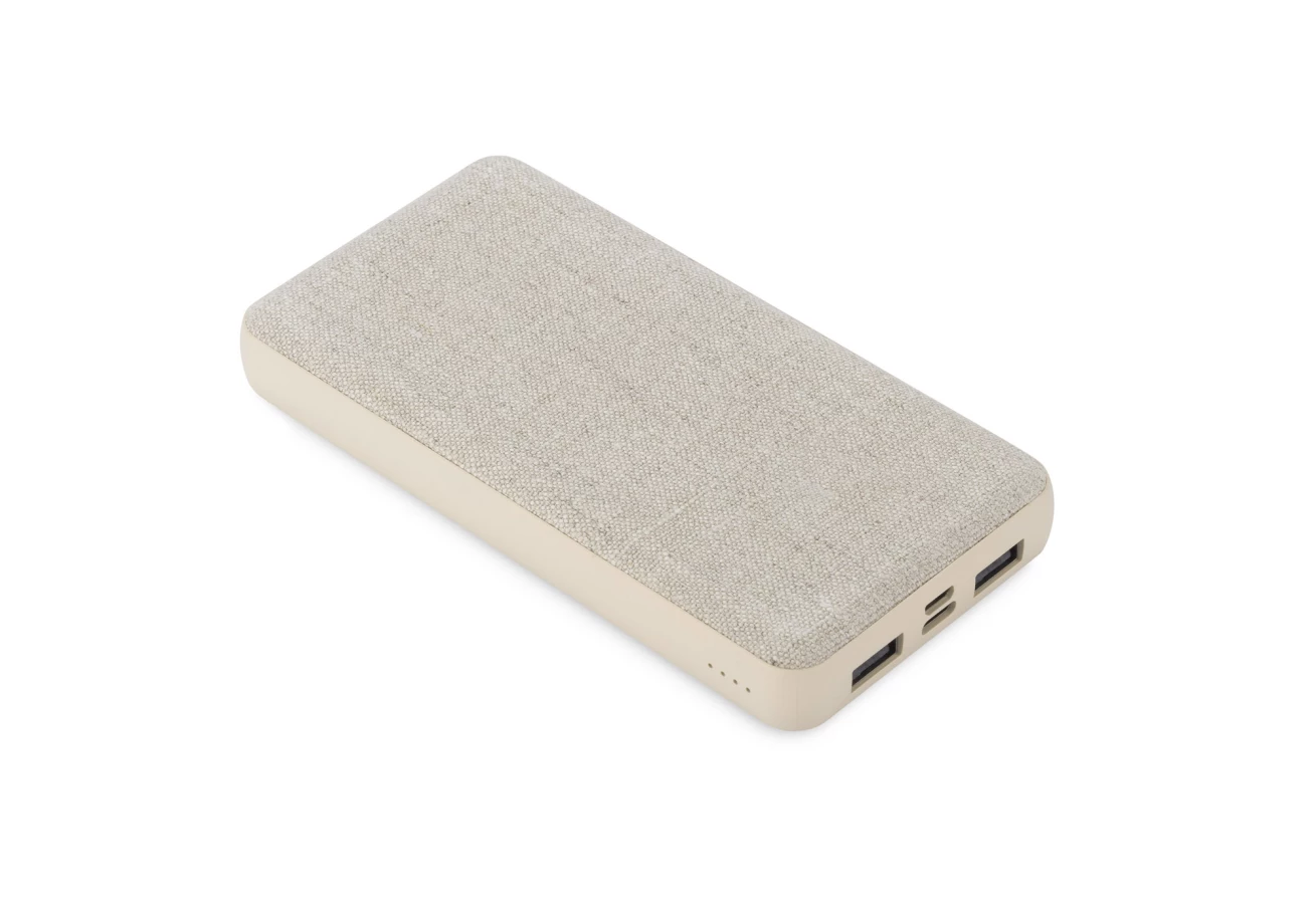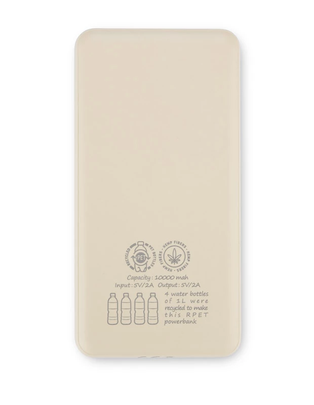 Power bank rPET REPPO o pojemności 10000 mAh wykonany jest z materiału pochodzącego z recyklingu czterech butelek o pojemności 1 litra oraz włókien konopnych. Produkt posiada możliwość ładowania poprzez 4 porty: 2 x USB-A, 1 x USB-C, 1 x microUSB. Dane techniczne: - wejście: 5V/2A, - wyjście: 5V/2A. Czterostopniowy wskaźnik naładowania. Produkt zgodny z odpowiednimi dyrektywami Unii Europejskiej, znak CE oraz 1 rok gwarancji. W zestawie kabel do ładowania z końcówką microUSB. Pakowany w kartonik z tektury pochodzącej z recyklingu wraz z nadrukiem do którego wykorzystano tusz na bazie soi.