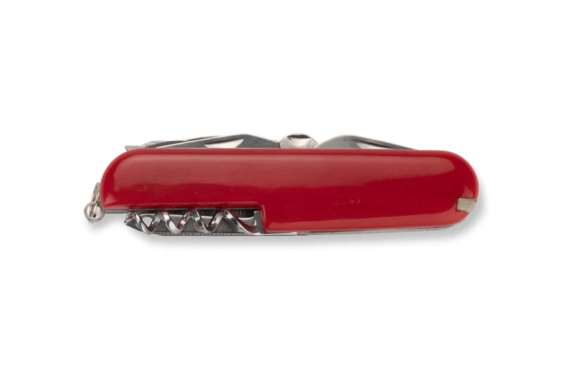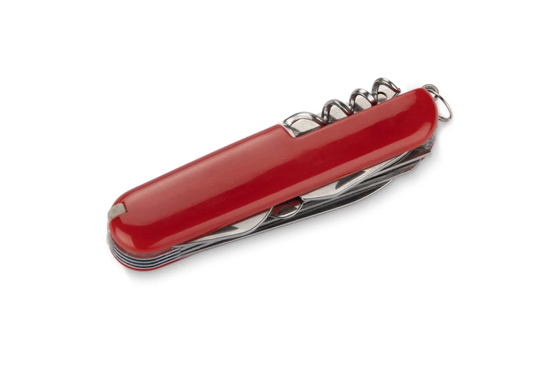Scyzoryk HIDI z rękojeścią w kolorze czerwonym, wykonaną z tworzywa. Posiada wszystkie niezbędne funkcje: nóż, piła, skrobak do ryb, nożyczki, otwieracz do puszek, otwieracz do butelek, śrubokręt, korkociąg, szydło oraz dziurkacz do skór.