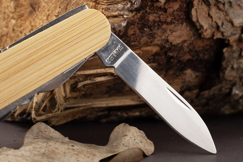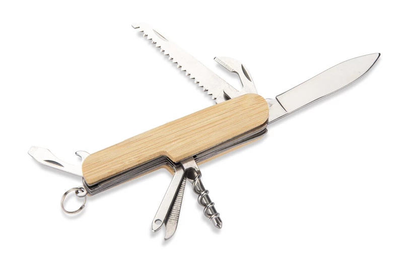 Scyzoryk KANA z bambusową rękojeścią wyróżnia się unikalnym, naturalnym wyglądem. Wyposażony w funkcje przydatne na co dzień i w terenie: nóż, piłę, skrobak do ryb, otwieracz do puszek i butelek, śrubokręt, korkociąg, szydło, dziurkacz do skór oraz kółko do kluczy. Praktyczny gadżet reklamowy, który sprawdzi się w każdej sytuacji.