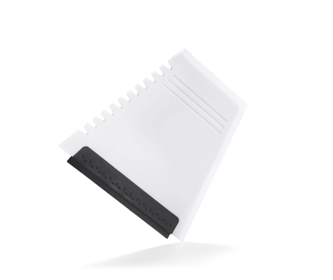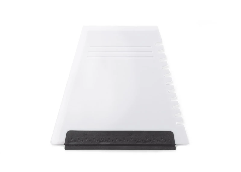 Skrobaczka do szyb z trzema końcówkami - płaską, ząbkowaną oraz gumową. Wykonana z tworzywa nietransparentnego.