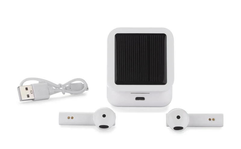 Słuchawki bezprzewodowe SUONO charakteryzują się bardzo dobrą jakością dźwięku i wygodą ze względu na doskonałe wyprofilowanie. Poręczne etui służy również jako stacja ładująca. Można je zasilać tradycyjnie poprzez ładowakę lub korzystając z panelu solarnego. Pojemność akumulatora to 200mAh do naładowania którego wystarczy około 5-6 godzin na słońcu. Pojemność słuchawek to 30mAh, które wystarczy na około 2 godziny czasu pracy. Wbudowany mikrofon pozwala na prowadzenie rozmów telefonicznych, a umieszczone na słuchawkach przyciski pozwalają na pauzowanie, przewijanie utworów, jak i na wezwanie asystenta głosowego. Wyświetlacz wskazuje na stopień naładowania baterii, jak i powiadamia nas o rozpoczęciu ładowania słuchawek. Zgodność z bluetooth 5.0, możliwość używania tylko jednej słuchawki.