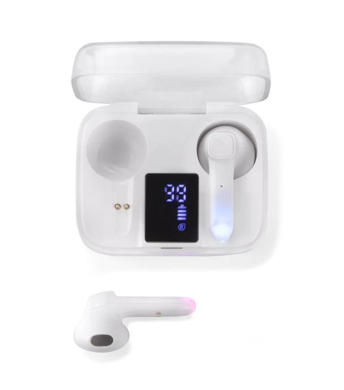 Słuchawki bezprzewodowe TRUVI to kompaktowych rozmiarów słuchawki douszne zapakowane w poręczne etui, które pełni jednocześnie funkcję akumulatora i umożliwia doładowanie urządzenia. Wyświetlacz LED pokazuje aktualny stan naładowania zarówno baterii w etui, a także każdej słuchawki. Dotykowe sterowanie słuchawek zapewnia wygodę użytkowania. Słuchawki posiadają wbudowany mikrofon, co pozwala na prowadzenie rozmów. Możliwość używania tylko jednej słuchawki. Dane techniczne: wersja Bluetooth: V5.1, częstotliwość Bluetooth: 2,4 - 2,48 GHz, zasięg Bluetooth: do 10m, pojemność baterii w każdej słuchawce: 30 mAh, pojemność baterii w etui: 300 mAh, czas pracy do 3 godz., czas czuwania: 300 godz.