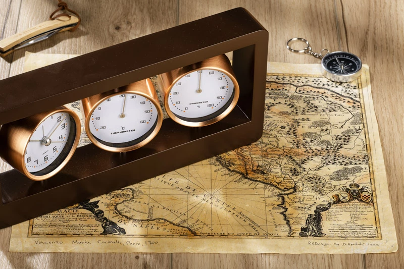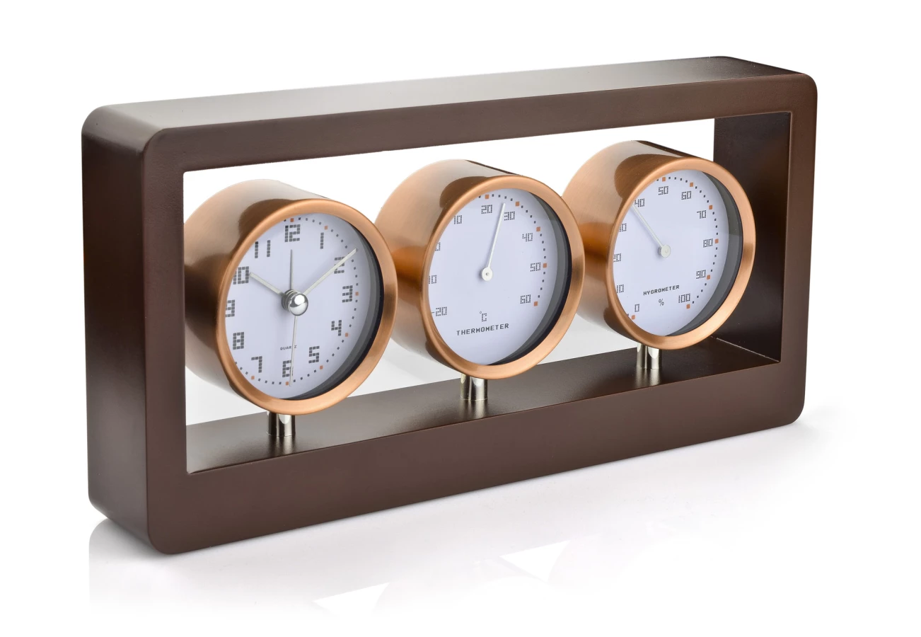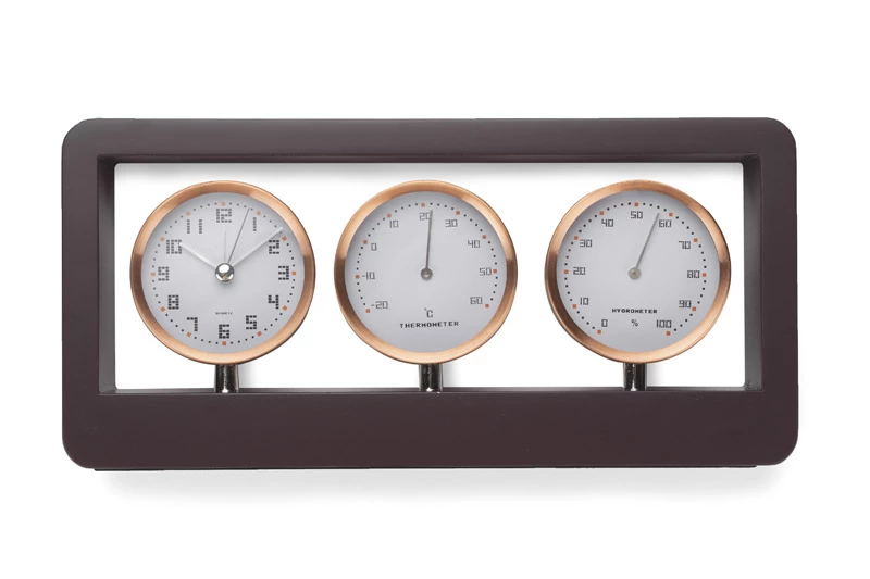 Zegar z funkcją budzika, termometr i higrometr przymocowane do drewnianej obudowy. Wymaga baterii: AA x 1 szt. Bateria nie dołączona.