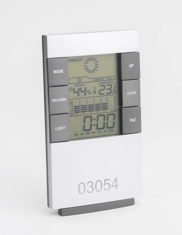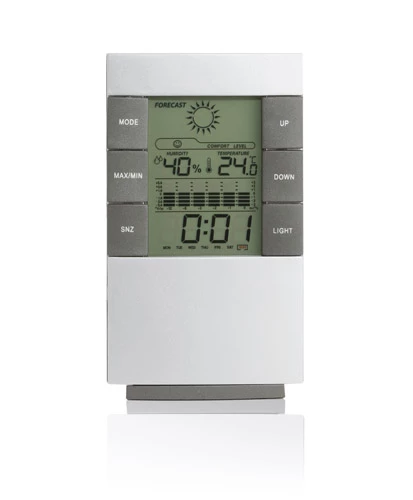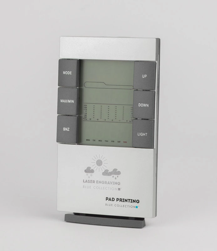 Używając tej nowoczesnej stacji prognozowanie pogody nie będzie już stanowiło problemu. Stacja posiada następujące funkcje:termometr (max/min), higrometr (max/min), zegar z budzikiem, kalendarz, biometr, przewidywanie pogody, podświetlenie ekranu. Logo nadrukujemy lub wygrawerujemy z przodu produktu.