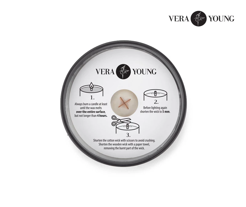 Świeca sojowa premium marki VERA YOUNG, wykonana jest ręcznie z naturalnych wosków roślinnych. Użyte kompozycje zapachowe powstały według autorskich receptur specjalnie opracowanych dla marki Vera Young w Europie.