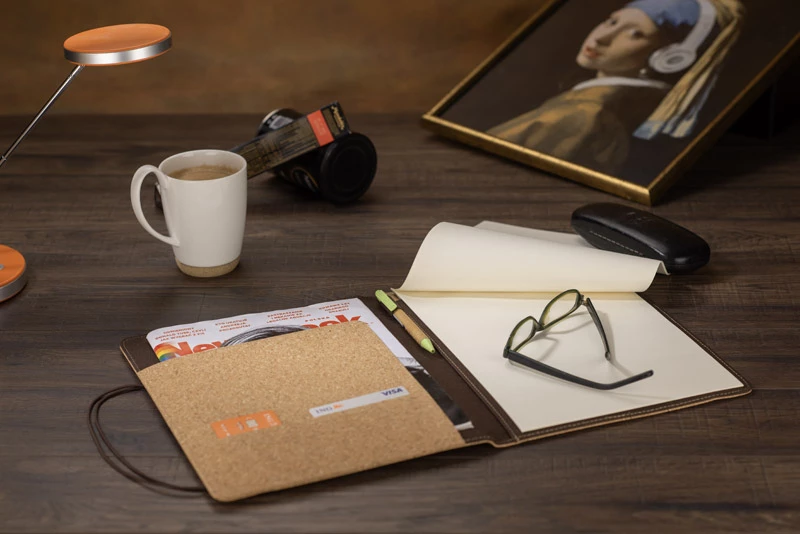 Korkowa teczka A4 z notatnikiem. Zawiera dużą kieszeń do przechowywania dokumentów, dwie mniejsze kieszonki oraz miejsce na długopis. Zamykana za pomocą gumki z metalowym elementem. Zapakowana w woreczek non woven.