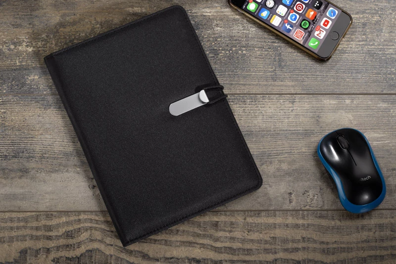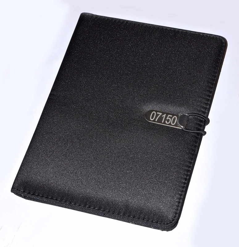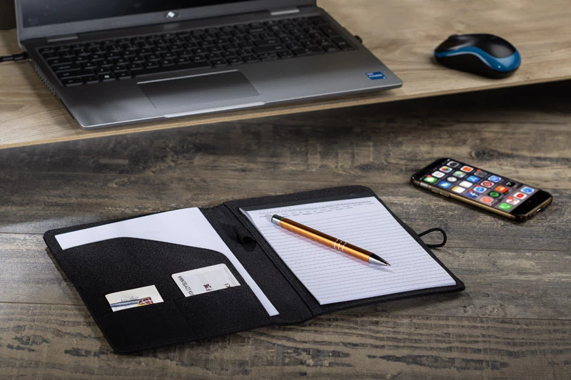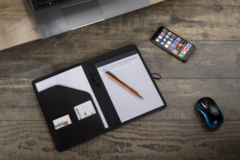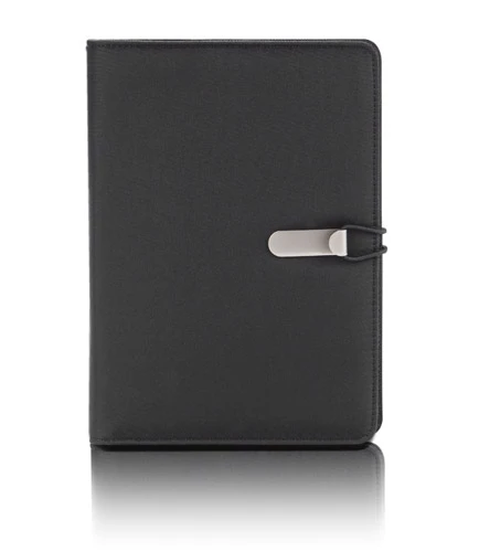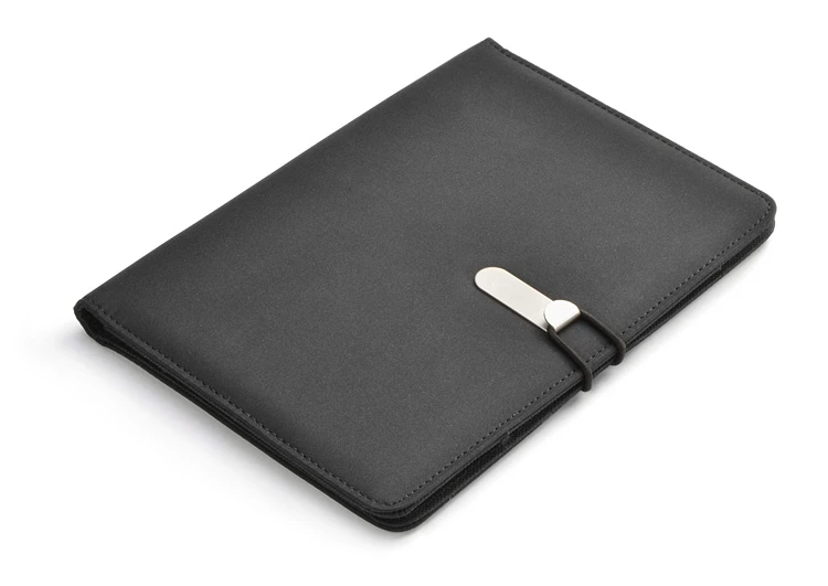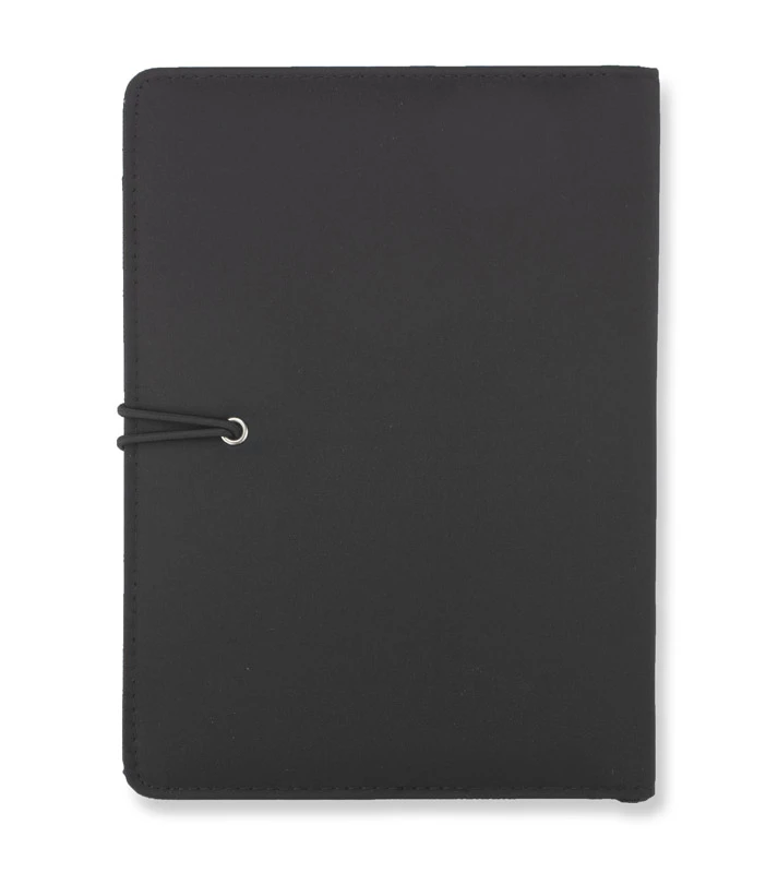 Prosta teczka o nowoczesnym wyglądzie. Zawiera dużą kieszeń, małe kieszonki, miejsce na długopis, notes. Teczka zapinana na gumkę zaczepianą o metalowy haczyk. Wykonana z mikrofibry i poliestru. Notes nie jest umocowany na stałe, ale wsuwany w kieszonkę, dzięki czemu można go łatwo wymienić. Logo wygrawerujemy na metalowym haczyku.